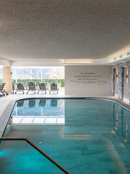 Egal, ob Sie schon am frühen Morgen in aller Ruhe Ihre Bahnen ziehen möchten oder nach der Wandertour Erfrischung suchen: Das Panoramahallenbad weckt die Lebensgeister und der wohlig warme Whirlpool ist die beste Medizin für müde Muskeln. Genießen Sie die sanfte Massage und den sprudelnden Klang des Wassers. An warmen Sonnentagen laden die Liegen im Garten zum Verweilen ein.