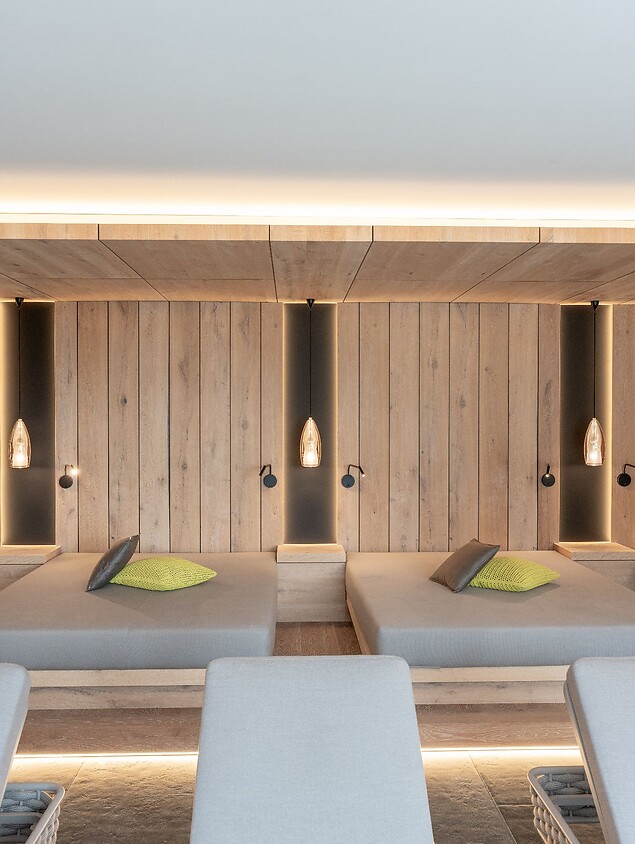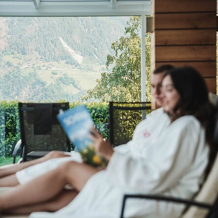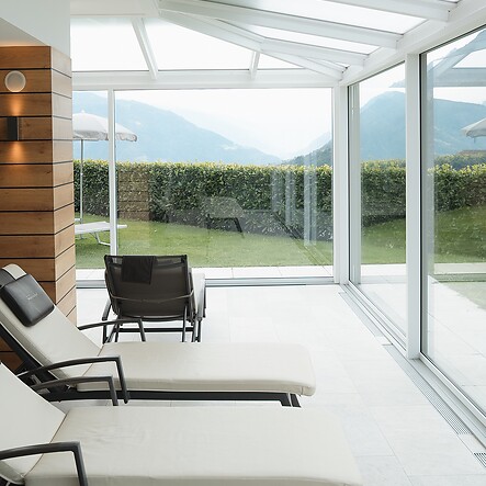Das Panoramahallenbad verfügt über einen direkten Zugang zum Garten, wo Sonnenanbeter und Ruhesuchende einen Rückzugsort finden. In den Sommermonaten bleibt die Glasfront zur Liegewiese geöffnet. In der kühleren Jahreszeit genießen Sie den freien Blick hinaus auf die Bergwelt, während draußen die ersten Blütenknospen sprießen oder fallende Blätter den Herbst einläuten. So erwarten Sie im Wellnessurlaub in Schenna jederzeit beste Aussichten auf Erholung.