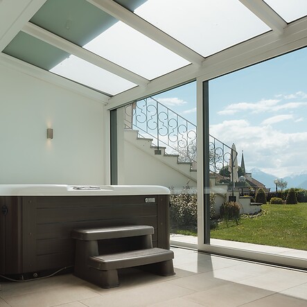 Was gibt es Schöneres, als vom Beckenrand in die Bergwelt zu blicken? Im Sommer bleibt die Glasfront geöffnet und man fühlt sich wie unter freiem Himmel.