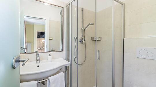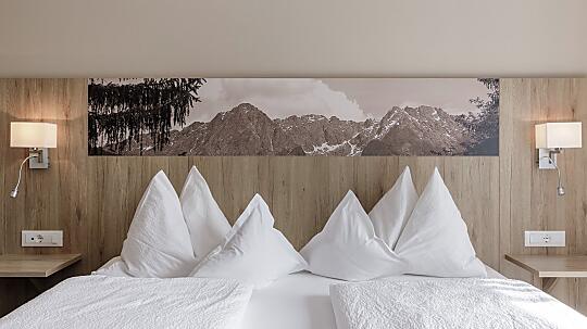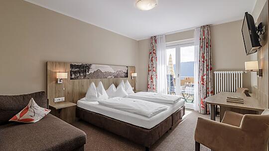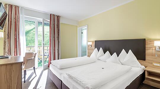 Kuscheliges Doppelzimmer, Ostbalkon zur Bergseite, Holzboden, Schreibtisch, Kofferablage, Telefon, Flachbildschirm TV - SAT, Safe, Badezimmer mit Dusche, WC, Haarföhn,...