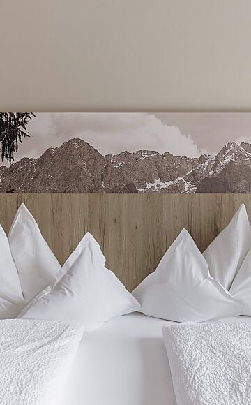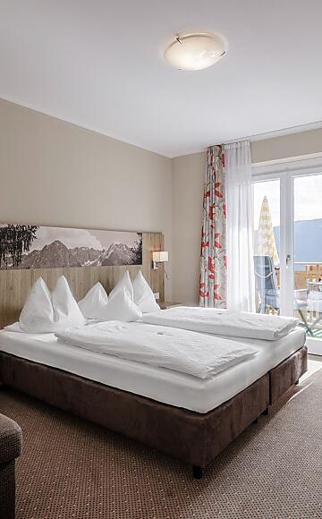Komfortables Doppelzimmer, Süd-Westbalkon mit Panoramablick ins Tal, Sitzecke, Schreibtisch, Kofferablage, Holzboden, Telefon, Flachbildschirm TV - SAT, Safe. Badezimmer mit Dusche, WC, Haarföhn, Pflegeprodukte.